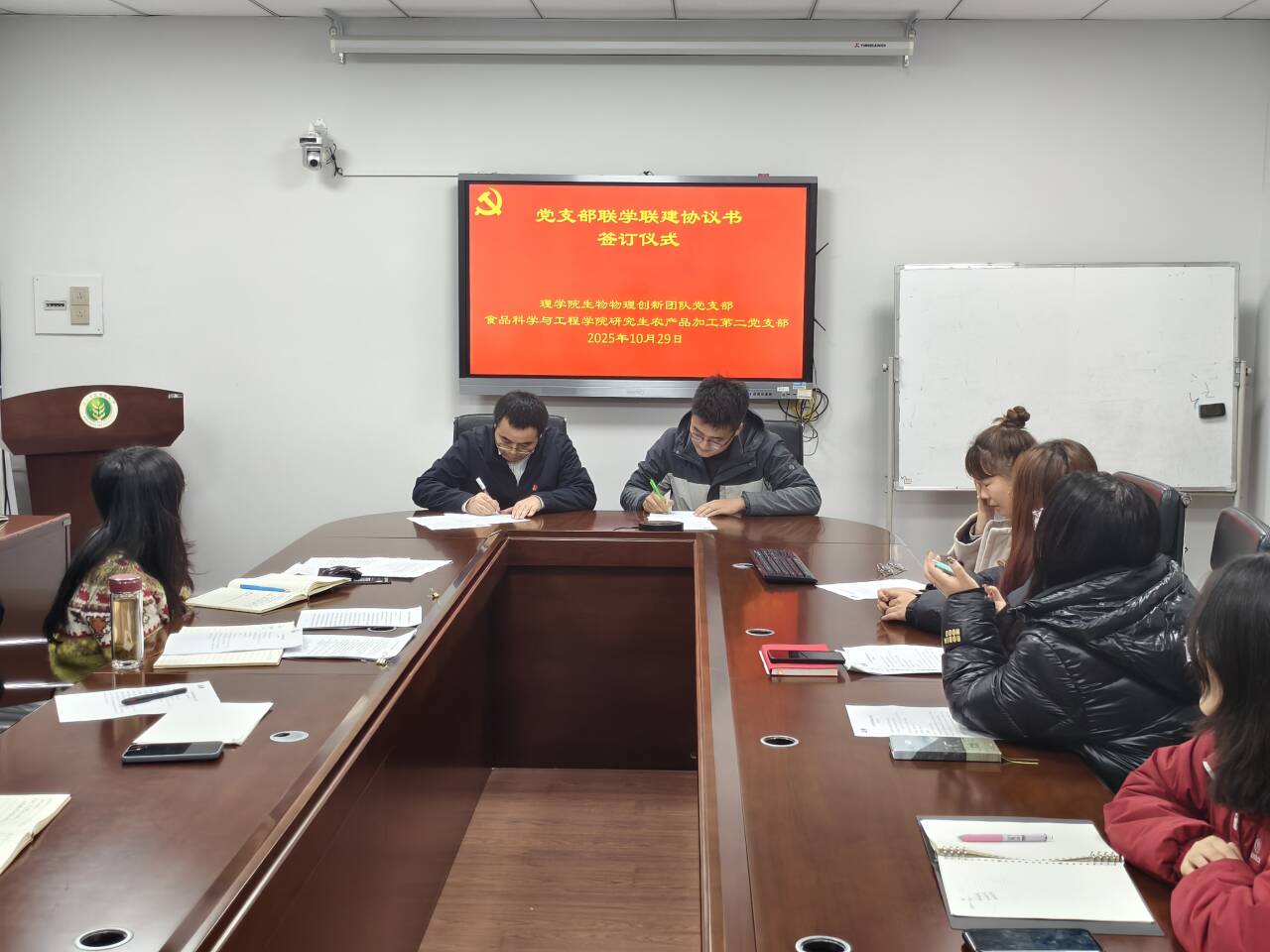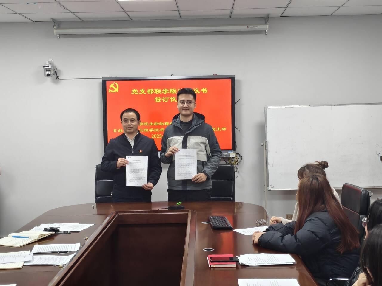 马梦瑶副书记结合食品学科发展实际,强调指出二十届四中全会关于完善科技创新体制机制的战略部署为食品领域研究指明方向。两个支部共同签署《党支部联学联建协议》,明确将二十届四中全会精神贯彻落实到农产品加工技术研发、食品营养安全评估等关键领域,建立常态化理论研学与科研协作机制。