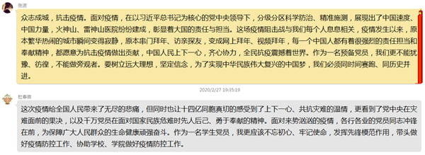 党员张芯蕊表示:“通过本次学习,我有一下几点收获:(1)在国家面临各种重大事件时,党员一定要发挥好先锋模范作用,只有这样才能体现中国共产党的宗旨,也只有这样才能高效快速地应对各种问题;(2)通过这次疫情处置也更能体现中国共产党的先进性,统观其他国家的应对效率、强度都说明了这一点;(3)这次疫情也更让我为自己是共产党员而自豪,能够加入到这个一心为人民的党组织我觉得十分光荣!最后,我相信在共产党的领导下,在全国各族人民的努力下,我们必定战胜疫情,恢复安稳和乐的生活!”党员温毓秀谈到:“在这次疫情中,全国上下一心,共同抗‘疫’,极大的体现了我国制度的优越性,要对疫情有一个正确的认识,不信谣不传谣,相信我们的国家。作为广大学生中一员的我们在这个特殊的假期里一定要珍惜时间,坚持学习,同时也要在有限的条件下加强锻炼,有一个健康的身体是一切的前提,一切艰难的日子都会过去,美好的明天必将到来!”党员郑路瑶说道:“通过本次学习,感触颇深,看了有关疫情的新闻后,我了解到这次疫情的严重性。在这疫情肆虐的非常时期,最辛苦的是冒着被感染的风险在救病治灾的白衣天使。其次,共同抗‘疫’,人人有责。降低感染冠状病毒风险的措施。就在科学技术快速发展的今天,我相信不久就可以解救痛苦的病人。让我们共同抗‘疫’,对自己和家人的健康状况提高警觉,从身边的小事做起,关注疫情,了解疫情,共同抗‘疫’。中国加油,武汉加油!”