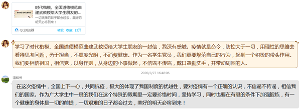 支部书记张凌雁带头发言,学习了时代楷模、全国道德模范曲建武教授给大学生朋友的一封信,我深有感触。疫情就是命令,防控大于一切,用理性的思维去看待思考问题,勇于担当,不虚度光阴,不消费健康。作为一名学生党员,我们更要规范自己的行为,起到一个积极的带头作用。我们要相信祖国,相信党,以身作则,从身边的小事做起,不信谣不传谣,戴口罩勤洗手,并带动周围的人。