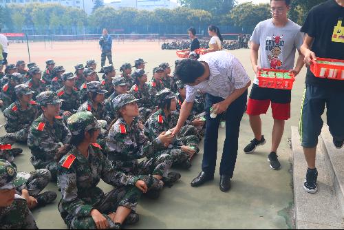 9月2日上午10点许,食品学院党委书记张振华来到新生军训场地,为广大新生同学送来亲切慰问,学院全体辅导员、团委学生会主要干部一同随行,共同看望正在烈日下训练的2019级新生。