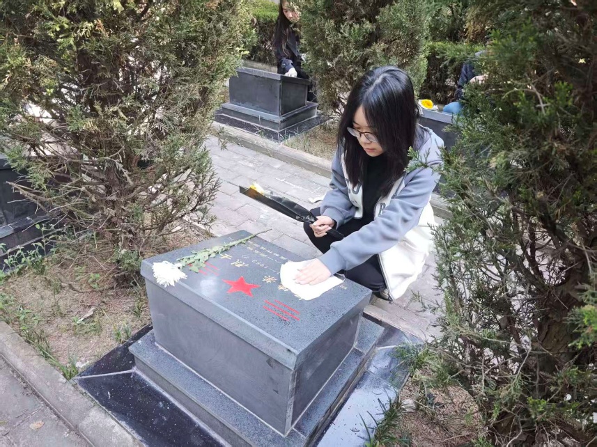 随后,师生们怀着崇敬之心,手持毛巾轻柔擦拭每一块烈士墓碑,拂去岁月尘埃,以虔诚之心与英烈进行跨越时空的对话。擦拭完毕后,大家依次将鲜花恭敬地摆放在墓碑之前,以洁白鲜花寄哀思,以赤诚之心慰忠魂。