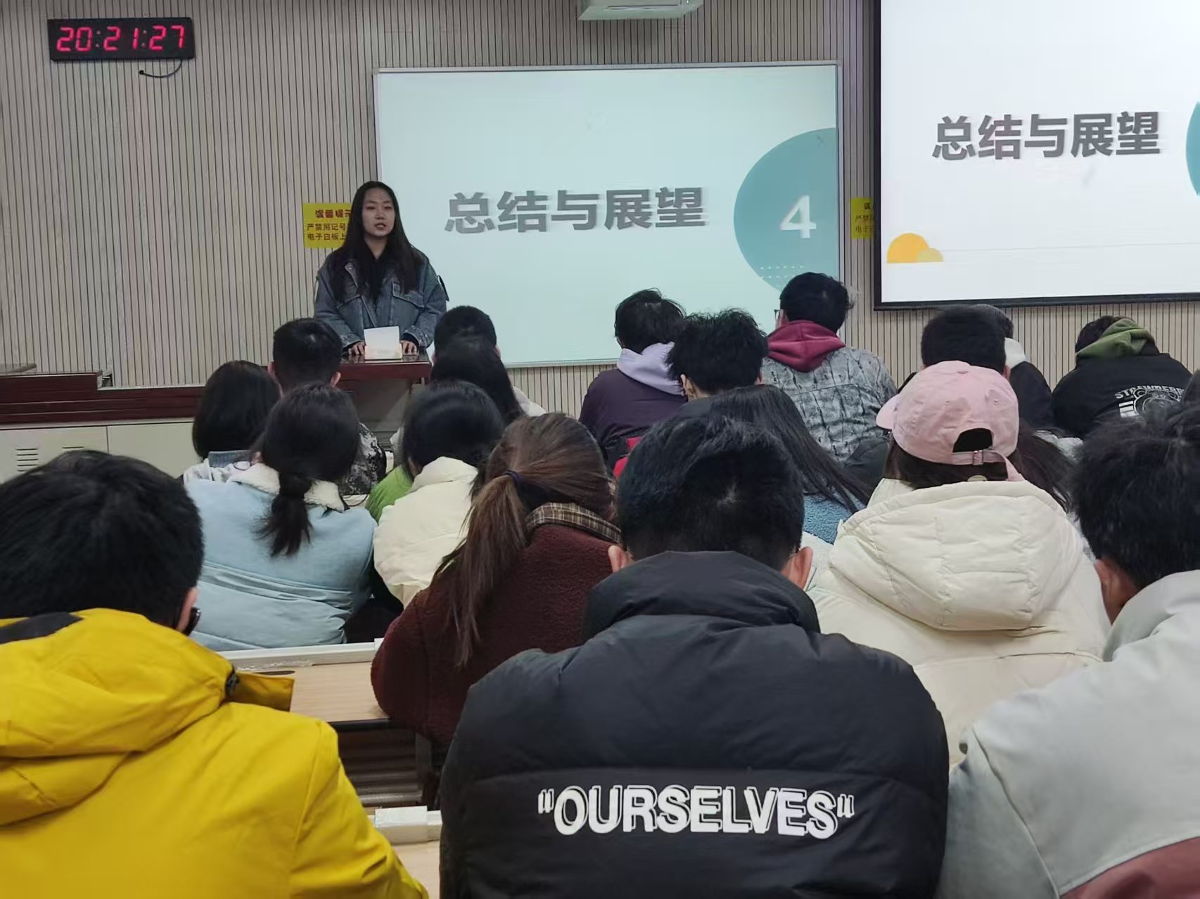 学习委员王洋、孙锦涛在发言中,着重介绍本学期的学习计划和安排。细致讲解课程预习、复习的实用方法,帮助同学们更好地掌握专业知识,学委还特别呼吁同学们在学习过程中互帮互助,组建学习小组,营造浓厚的学习氛围。团支书王静怡则从班级团建、思想建设等方面进行总结。回顾过去,团支书提到班级组织的各类团建活动,如户外拓展、主题团日等,有效增进同学们之间的情谊,增强班级凝聚力。展望未来,团支书表示将继续开展丰富多彩的活动,同时也鼓励同学们在思想上积极进取,向党组织靠拢,参与各类志愿服务活动,提升个人思想觉悟和社会责任感。