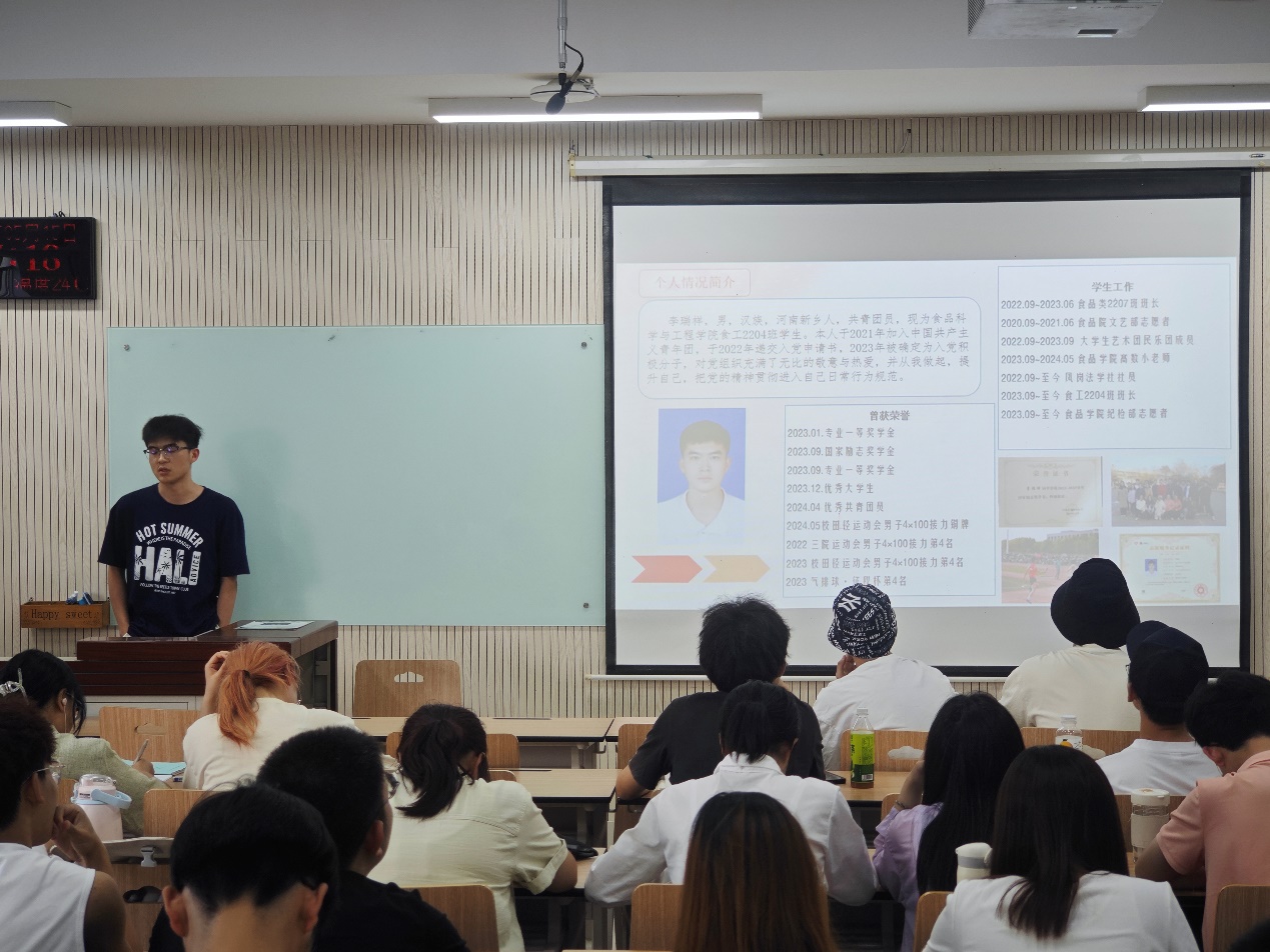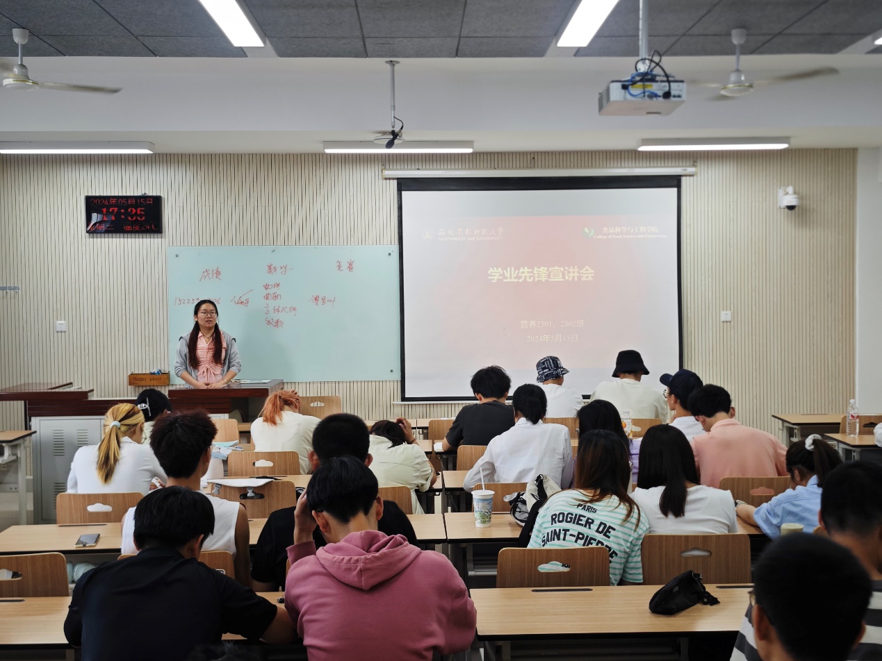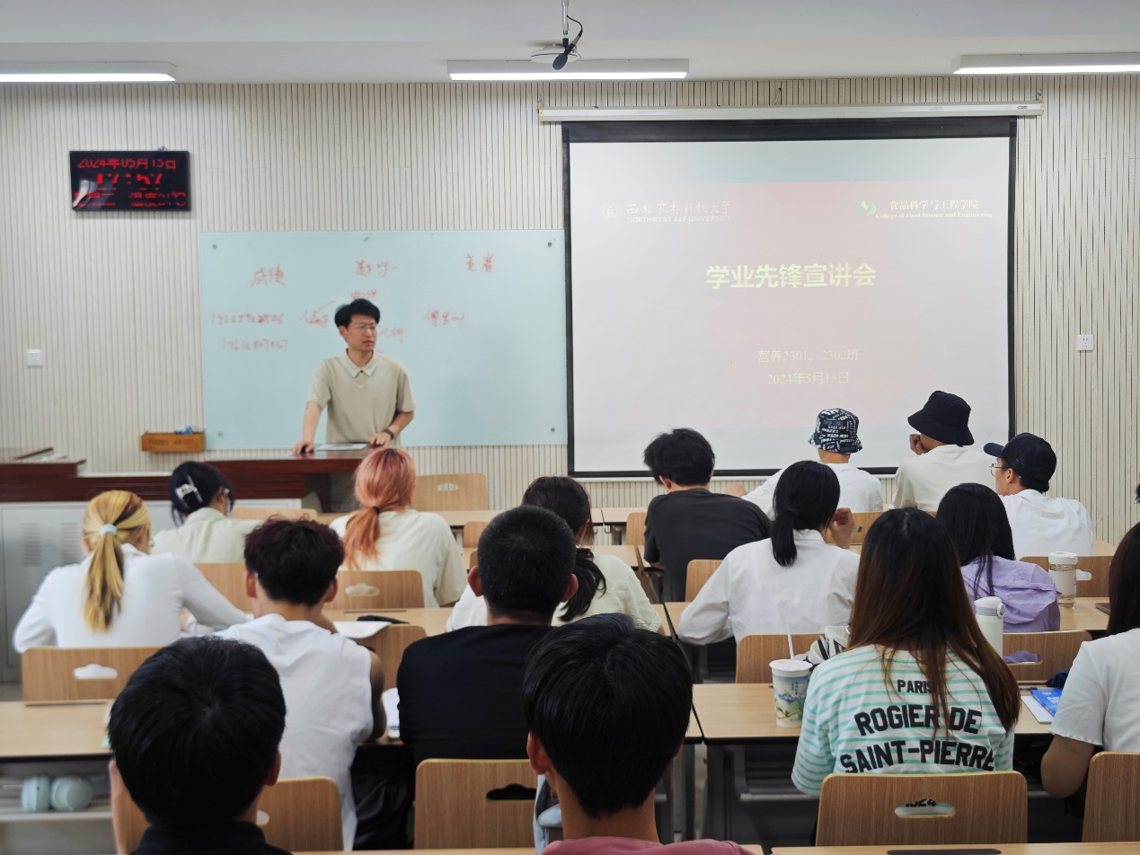 为进一步落实教育教学工作,帮助同学们加深对所学专业的了解,进一步明确目标和发展方向,同时促进良好班风的建设,夯实学科发展的基础。营养2302班于5月15日下午5点在N8610开展了学业先锋宣讲会。本次宣讲会营养2302班全体成员参与,并邀请李瑞祥学长与秦丽萍学姐作为宣讲人向同学们分享学习经验。同时食品科学与工程学院团委副书记、23级本科生辅导员许淼杰老师特邀出席会议,为同学们讲解未来的学业规划。