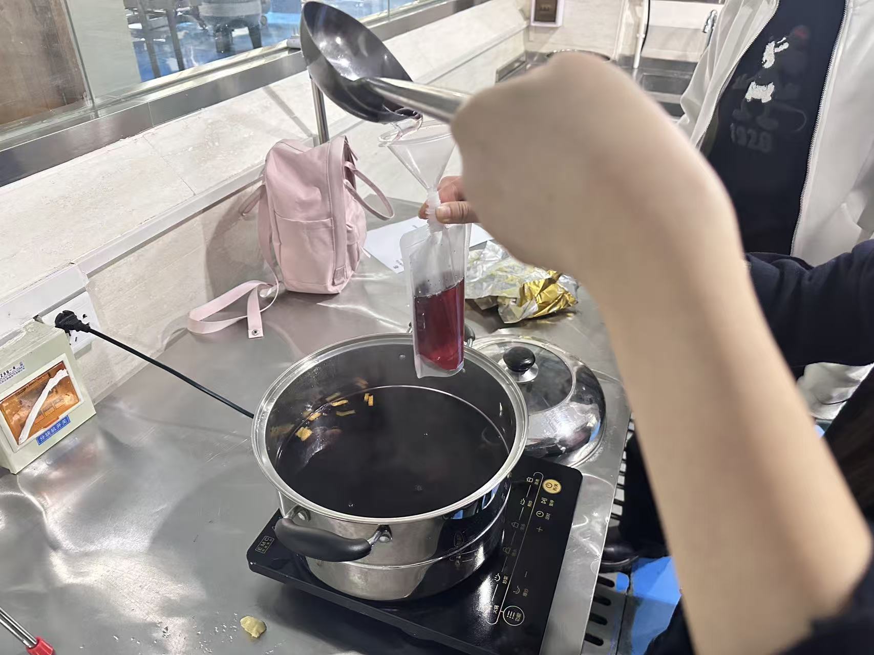 活动伊始,社会实践部负责人郑煊简要介绍了本次活动的目的与意义。随后,同学们在志愿者指导下分组展开制作。在酸梅汤制作区,大家按照传统配方,精心挑选乌梅、山楂、陈皮、甘草等原料,经过浸泡、熬煮、过滤、调味等工序,一锅锅色泽浓郁、酸甜适口的酸梅汤新鲜出炉。在小饼干制作区,同学们分工协作,从称量配料、搅拌面团到擀压成型、烘烤出炉,每一步都一丝不苟。车间内香气四溢,欢声笑语不断,洋溢着温暖而热烈的氛围。