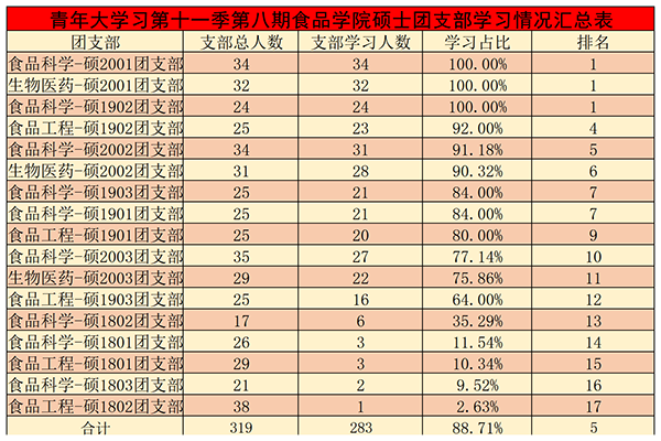 青年大学习第十一季第八期食品学院硕士各团支部学习情况汇总表