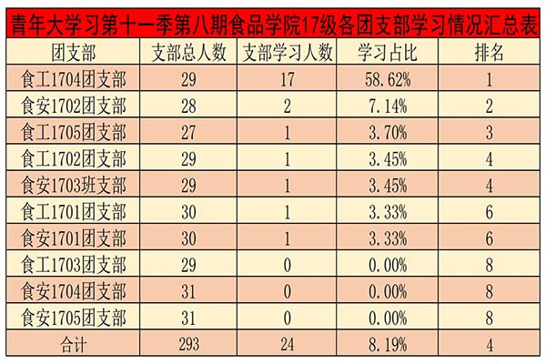 青年大学习第十一季第八期食品学院17级各团支部学习情况汇总表