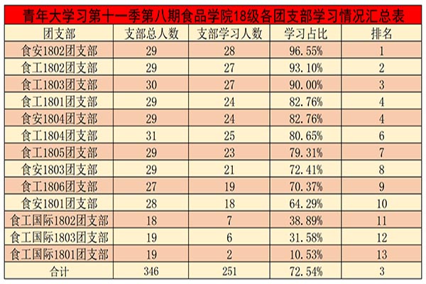 青年大学习第十一季第八期食品学院18级各团支部学习情况汇总表