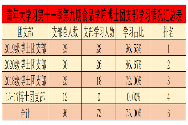 青年大学习第十一季第八期食品学院博士各团支部学习情况汇总表