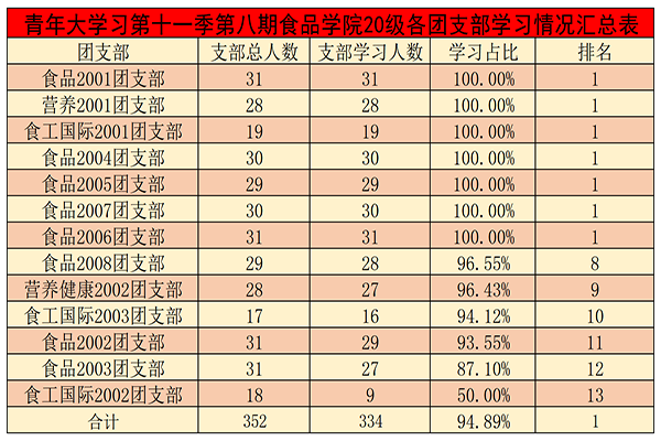 青年大学习第十一季第八期食品学院20级各团支部学习情况汇总表