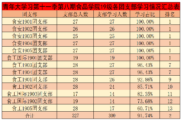 青年大学习第十一季第八期食品学院19级各团支部学习情况汇总表