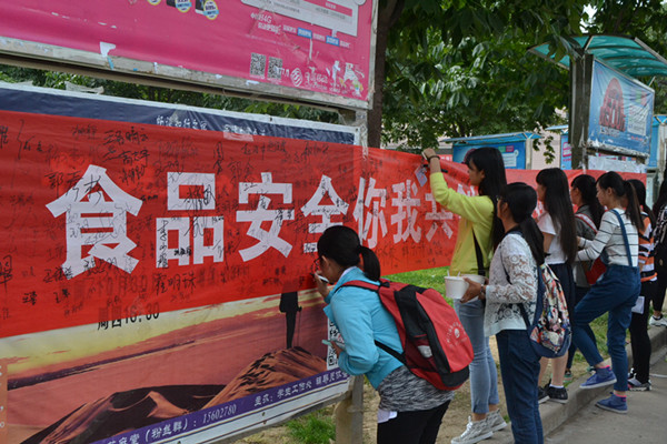 活动期间,食品学院的同学们发挥专业特长,向同学们介绍食品安全常识、食品安全常用概念。在全世界关注食品安全的大背景下,我校学生也对食品安全的认知程度有所提高,在活动现场举行的答题环节中,不少同学能够过关斩将,获赠精美礼品。大家纷纷在横幅上签下自己的名字,希望更多的人关注食品安全、学习食品安全。